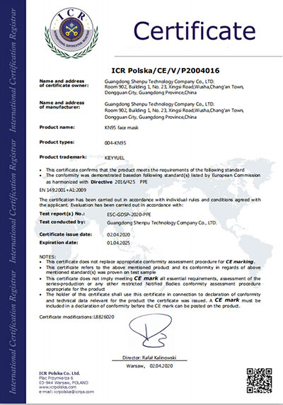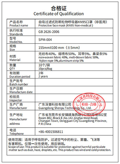 Maskra protettiva N95 (tiwi)-Certificate of Qualification